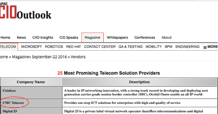 A prestigious Information Technology and Telecom Magazine in Asia Pacific – APAC CIO Outlook has launched 25 enterprises voted most promising telecom (APAC 25 Most Promising Telecom Solution Providers) in the Asia Pacific.